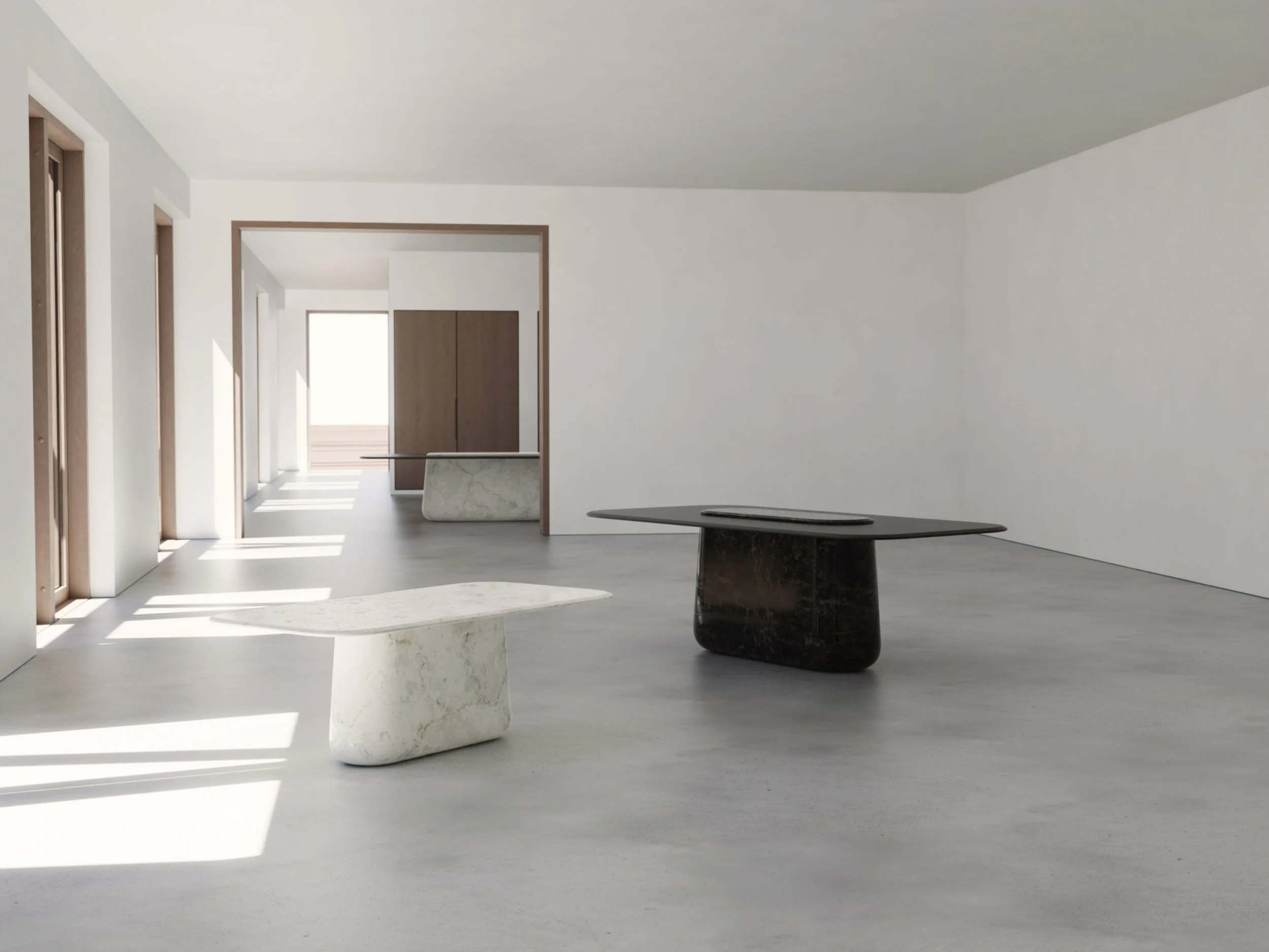 A collection of tables driven by new eating habits, sharing and grazing. A centre console detail elevates key dishes and plates for diners to share around a lower level.